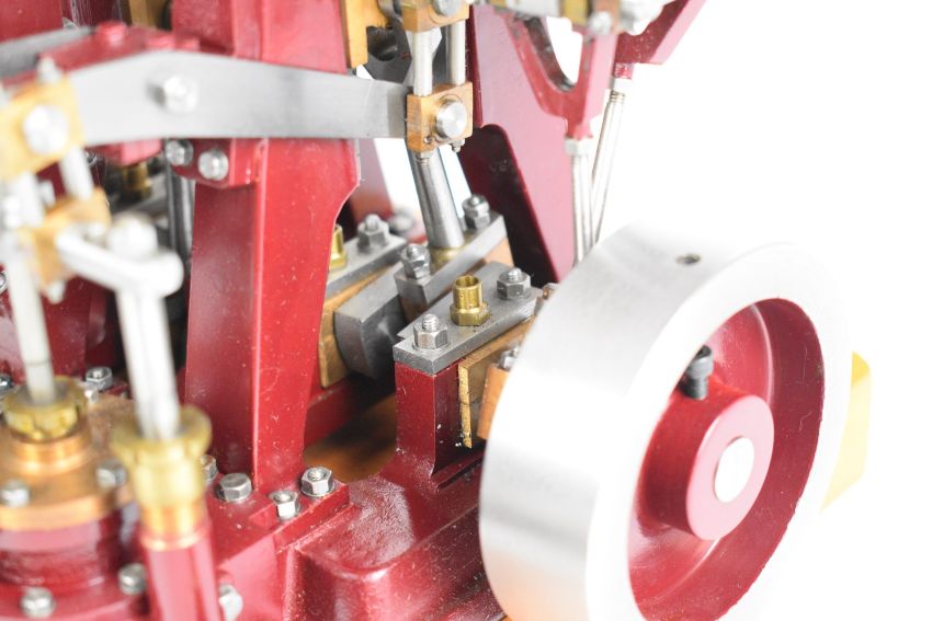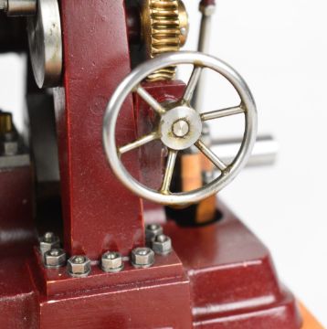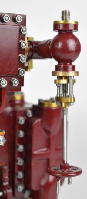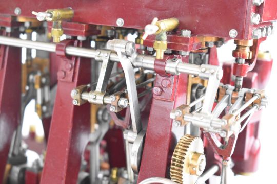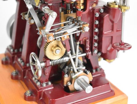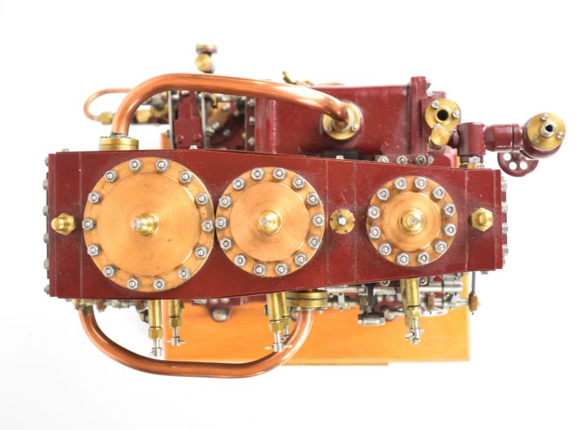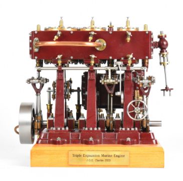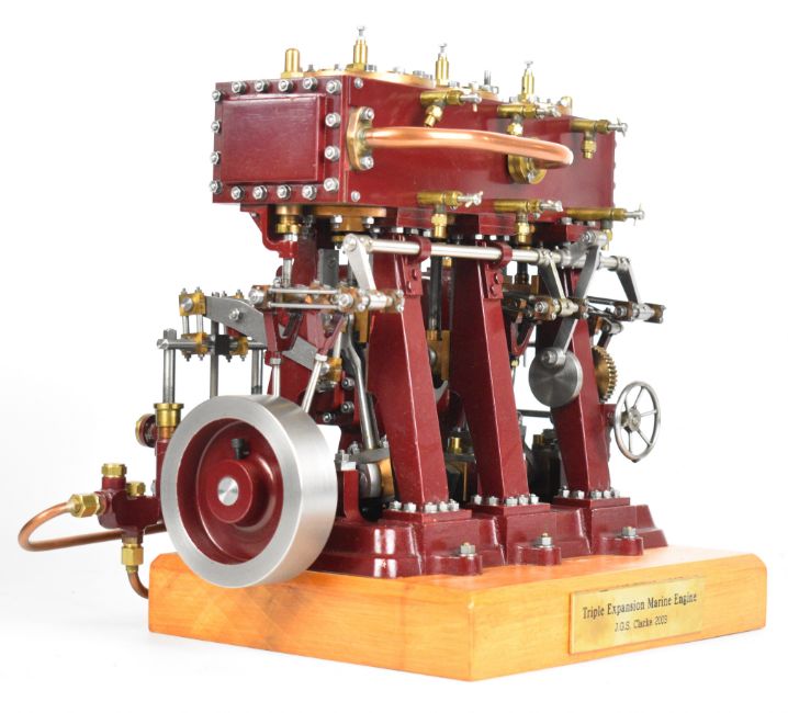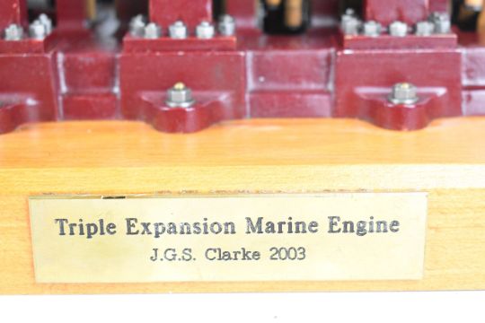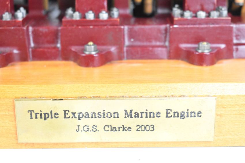 John Clarke O.B.Bolton live steam triple expansion marine engine with handwheel operated throttle valve, wheel operated Stephenson's link reversing valve gear, full set of six cylinder drain cocks, oil cups on all main bearings, driving a solid flywheel and via rocking shaft an air pump, and twin boiler feed water pumps, the air pump feeding into a condenser, on wooden base with builder's name and date 2003 to front, L 27.5 x D22 x H26.5cm