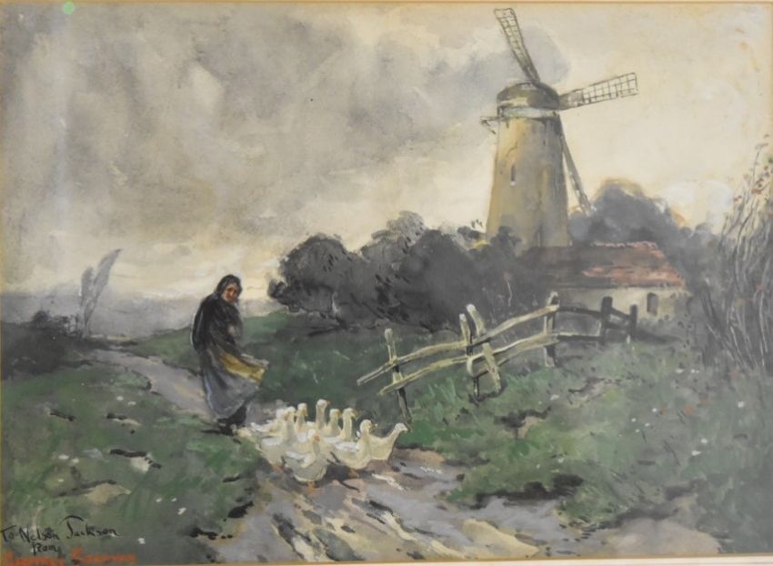 Geoffrey Strahan (1839-1916) watercolour of a windswept lady herding a flock of geese before a windmill, signed and dedicated to Nelson Jackson lower left, 25 x 34cm, in silvered frame