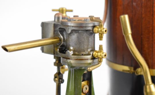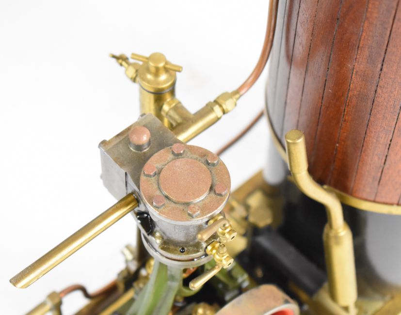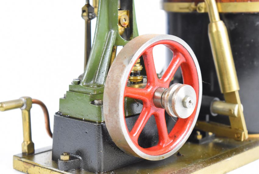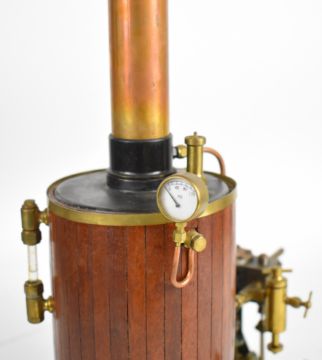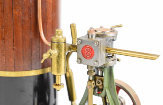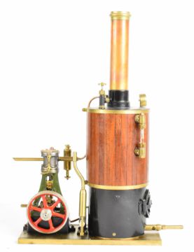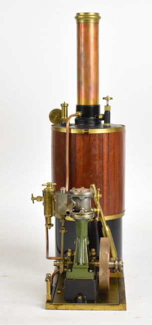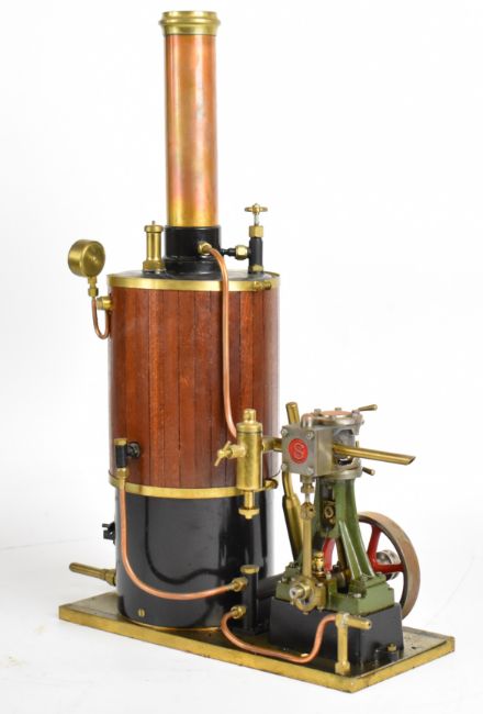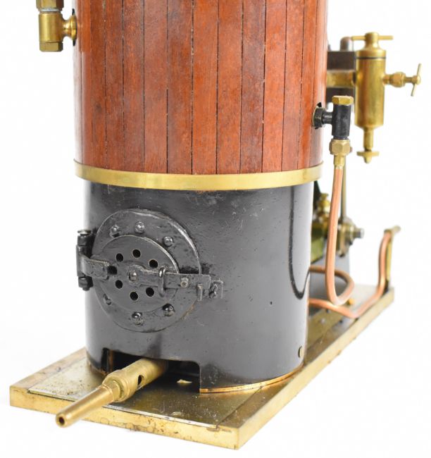 Stuart 10V live steam plant comprising engine with spoked flywheel, hand pump, gas burner and lagged boiler with 0-120 psi pressure gauge, safety valve and water level gauge, overall height 41cm, boiler diameter approximately 11cm