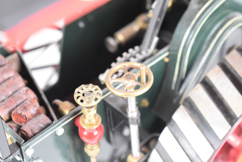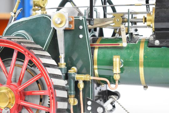 Maxwell Hemmens 1 inch scale coal fired live steam traction engine or road locomotive, the silver soldered copper boiler having water gauge glass, 0-120 psi pressure gauge and twin Ramsbottom style safety valves, the ashpan damper operated from a lever beside the footplate, the single cylinder lubricated by a ratchet lubricator and controlled by Stepehenson's link reversing gear operated by a quadrant on the footplate, driving by high and low gear with lever beside the regulator handle. The boiler fed by a crank driven pump with bypass valve, the rear axle having winch drum and working brakes, numbered to rear of bunker 162 and with canopy named J & H McLaren & Co. L 46 x W 20 x H33cm