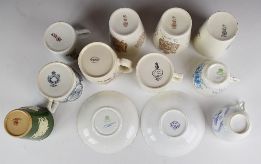 A collection of commemorative mugs, teaware and beakers by Royal Doulton, Spode, Minton etc, including marriage of The Prince of Wales and Alexandra, Queen Victoria’s Diamond Jubilee celebrations from Leicester and from Hitchin, 1911 Coronation of George V from Scarboro, Queen Victoria Jubilee beaker from Copeland in dark green with raised white relief panels etc