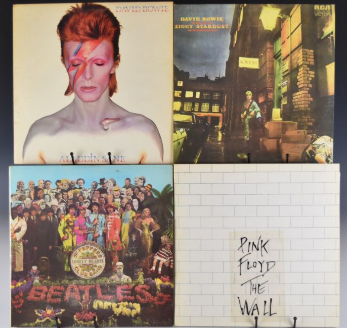 Thirteen Prog Rock / Folk Rock LPs including Pink Floyd The Wall with lyric liners, The Beatles Sgt Pepper with Garrod & Lofthouse single flip fold fully laminated gatefold sleeve, David Bowie Ziggy Stardust with lyric insert and band photos, Aladdin Sane with gatefold sleeve, blue / red lyric insert and Hunky Dory with sepia lyric liner, Family Bandstand, Fox Tails Of Illusion, Exiled, Curved Air and three Harry Chapin. Vinyl generally appears VG+ to Ex+