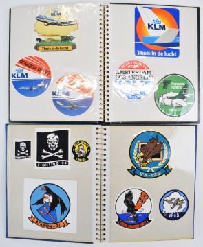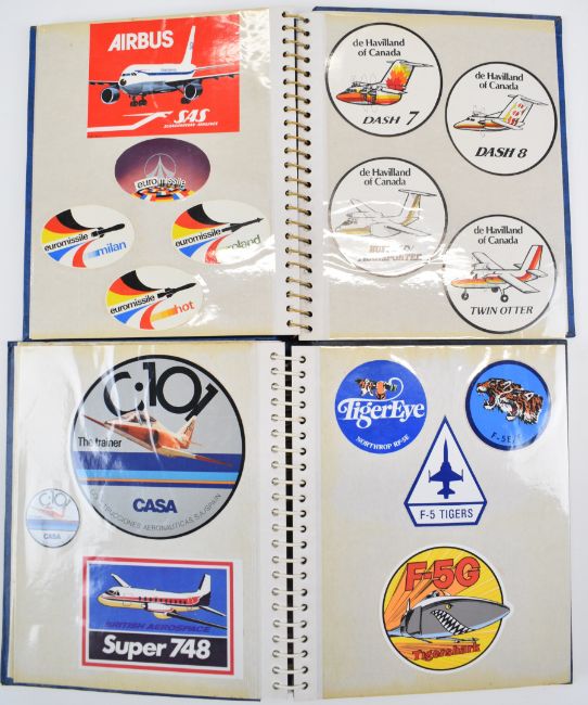 Terence Burke Collection seven albums of mainly aviation, space and military promotional and commemorative stickers, all still on the backing, mostly obtained either by attending the event or by prolific letter writing, requesting stickers for his collection, to include Augusta, France, Spain, European space interest, Boeing 707, 727, 737, 747, 757 and 767, DC-10, Airbus A300, Hawker Siddeley, Shorts 330, Dehavilland Dash 7, General Dynamics F-16, Grumman, Farnborough 1978, Paris Air Show 1977, Red Arrows, Fly Navy, Greenham Common Air Tattoo 1979, Bassingbourn Air Festival 1978, F-18 Hornet, Northrop target drone, Chinook, Sea Harrier, Casa-212, Fokker, Rolls Royce, British Aerospace 146, KLM, Aerospatiale, Aermacchi, US Navy squadrons, Skylab, Apollo 3, 7, 8, 9, 10, 11, 12, 13, 14, 15, 16 and 17, Space shuttles, Goodyear airship, Saab and Plessey. Please see lot 1055 for a short history of Terence Burke and his aviation photography