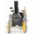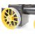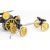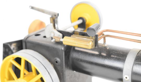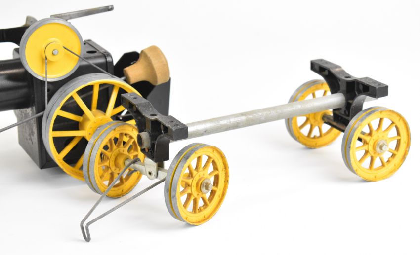 Mamod TWS1 live steam traction engine and matching lumber wagon, with yellow painted wheels and flywheel and a steering extension rod