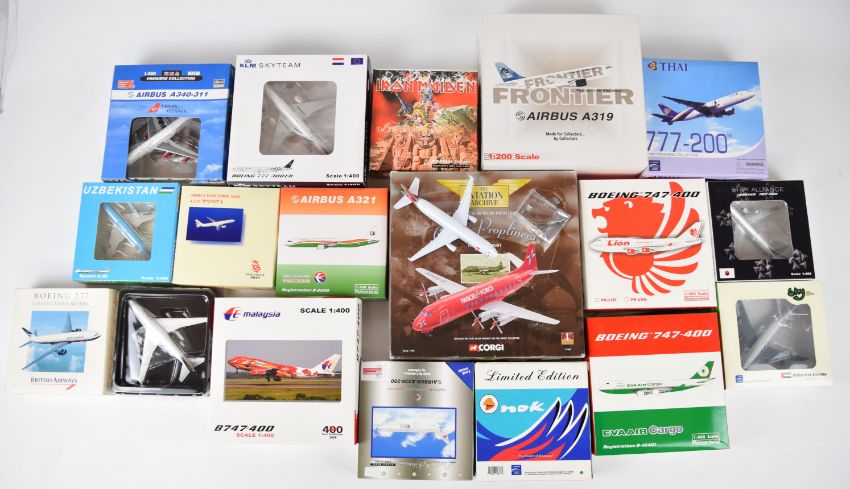 Eighteen 1:200 and 1:400 scale diecast model by Hasegawa, Corgi, Sky500 and similar with liveries to include Virgin Atlantic, Qatar Airways, KLM, China Eastern, Star Alliance Asiana and Lion Air, all in original boxes.