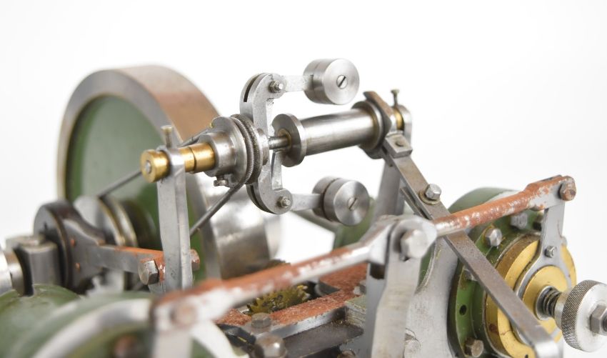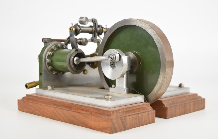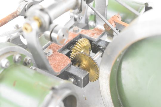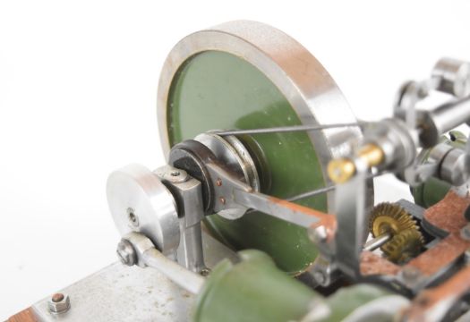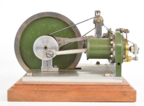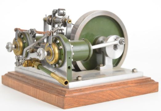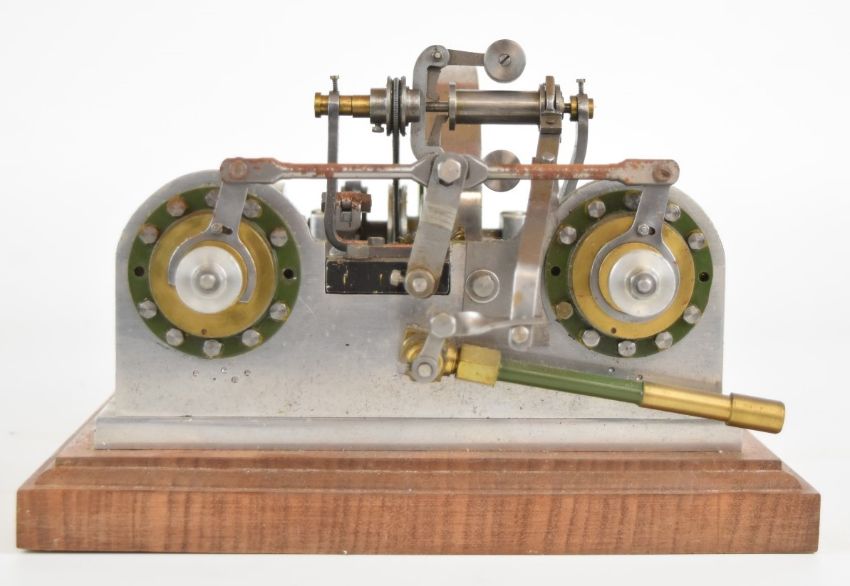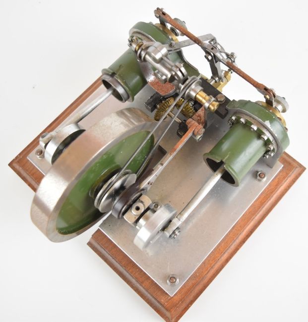 Unusual rotary valve live steam twin cylinder engine with eccentric driven rotary or disc valves, with working governor, on wooden base, overall width 22cm