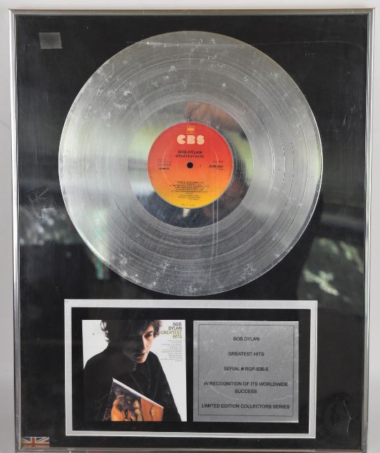 Bob Dylan Greatest Hits (CBS (5) BPG 62847) limited edition collector's series silver disc in display frame, needs new perspex / glass