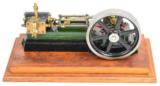 Stuart S50 live steam single cylinder engine with throttle valve and twin drip lubricators to the main bearings, on wooden base, overall length 27cm
