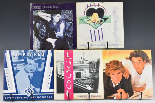 Over four hundred 1980s/1990's 7" Indie Rock / New Wave / Post Punk / House / Trance / Electronic / Pop and Hi-NRG singles, mostly in correct picture covers and including many rarities, artists include Lori & The Chameleons, Simple Minds, Simply Red, Wham, Visage, Darling, Flock of Seagulls, Gavin Friday, The Creatures, Cocteau Twins, Sinead O'Connor, Hazel O'Connor, Norman Cook, Communards, Fury Eyes, Cranberries, Furniture, Cutting Crew, Deaf School, Pet Shop Boys, Piranhas, Photos, Pig Bag, Perfect Strangers etc. Condition appears to be VG+ to NM, mostly at upper end, most have small indexing sticker