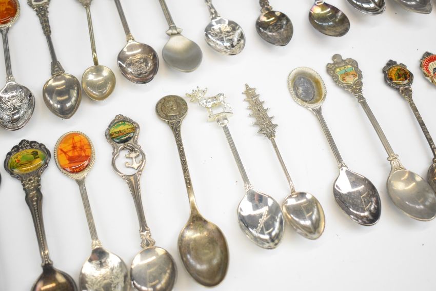 Approximately one hundred collector's souvenir silver plated tea spoons to include Las Vegas, Hollywood, Grand Canyon, Edinburgh Castle, The Needles, Tetley, Charles & Diana, Humber Bridge, Snowdon Summit, Queen Elizabeth Coronation, R.N.L.I., Isles of Scilly, Disneyland, HMS Victory and Bounty, a locomotive, camel, spinning wheel, lion, castle, Chinese pagoda, thistle etc