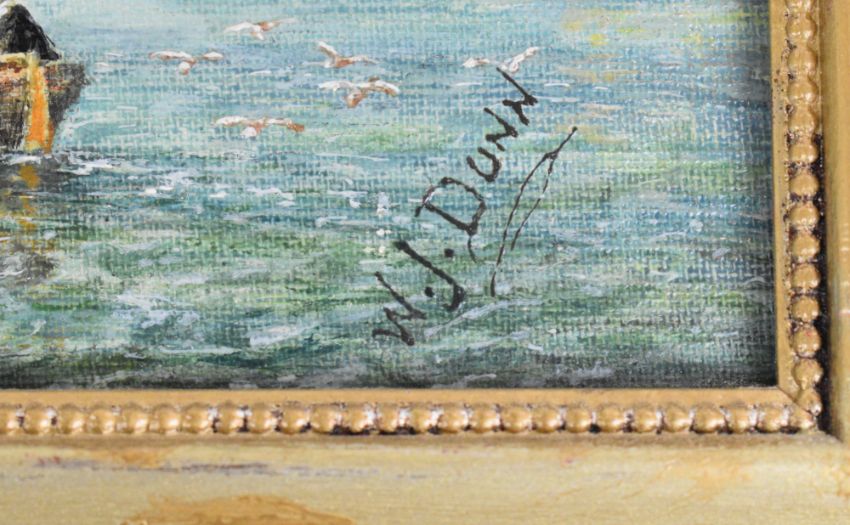 W.J. Dunn oil on canvas sailing boats surrounded by smaller tenders coming into port, possibly Dartmouth or similar, signed lower right, 28 x 39.5cm