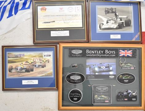 Formula One, land speed and similar framed ephemera to include signed items by Jackie Stewart, Nigel Mansell, Ken Tyrrell, Richard Noble and Andy Green, largest 43cm x 33cm, together with three F1 team flags