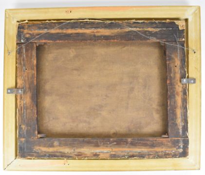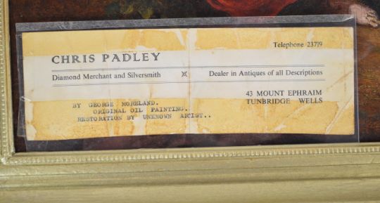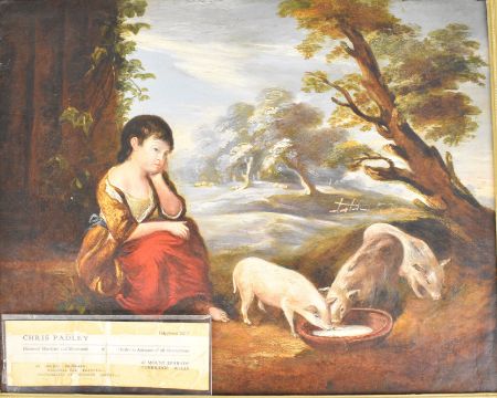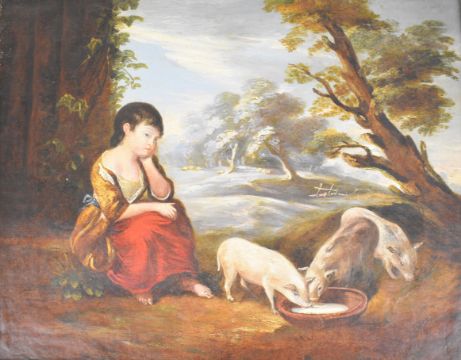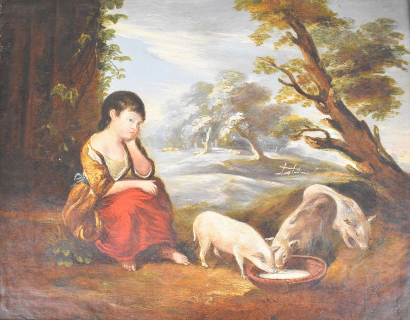 Attributed to George Morland (1763-1804) girl looking after three piglets with sheep amongst trees beyond, 40 x 49.5cm, in gilt frame with label verso giving artist's details on Chris Padley of Tunbridge Wells dealer's paper