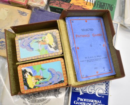 [Playing Cards] Goodall 1902 Coronation cards complete in original case, an early part set of colour playing cards (single headed court cards), a sealed packet of cards illustrating the Royal Commonwealth Tour 1953-4, Royal Visit to Denmark 1957 and Sir Winston Churchill, selection of cards from Hignett’s Crown Jewels Cigarettes, examples from De La Rue, Hunt & Son, Reynolds & Sons, Andrew Dougherty, Chas Goodall & Son, Manikin Prize Medal, Elephant Brand (boxed), facsimile set of Arms of English Peers of 1688, boxed Lincard game, Game of Patience by Wills 1933 boxed with instruction booklet, U.S. Whist Markers printed for 1901 and others, collection of miniature playing cards, James Bond Tarot card set, 19th century King of Coins Tarot card, Egyptian Tarots etc