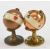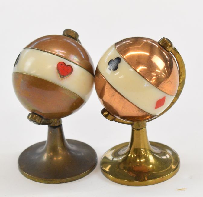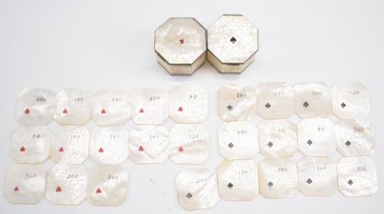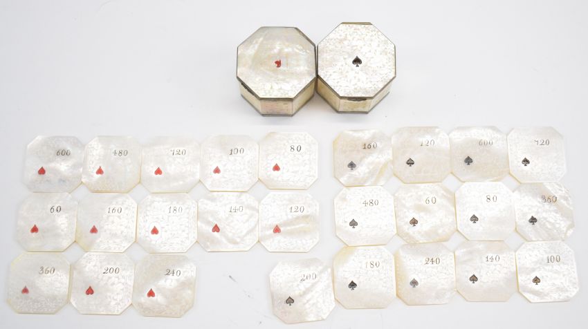 Mother of pearl playing pieces with elaborate decoration and with coloured suit symbol and numbering comprising 13 spade and 13 heart counters, both sets contained in matching decorated mother of pearl octagon shaped pots with hinged lids. Set of four porcelain 19th century whist markers with suit symbol one side and inscribed in italics on reverse Simple, Double, Triple and Quadruple, each approximately 3cm housed in silk lined and gilt decorated clasped leather case and two copper and brass Bridge or Trumps miniature globe shaped markers