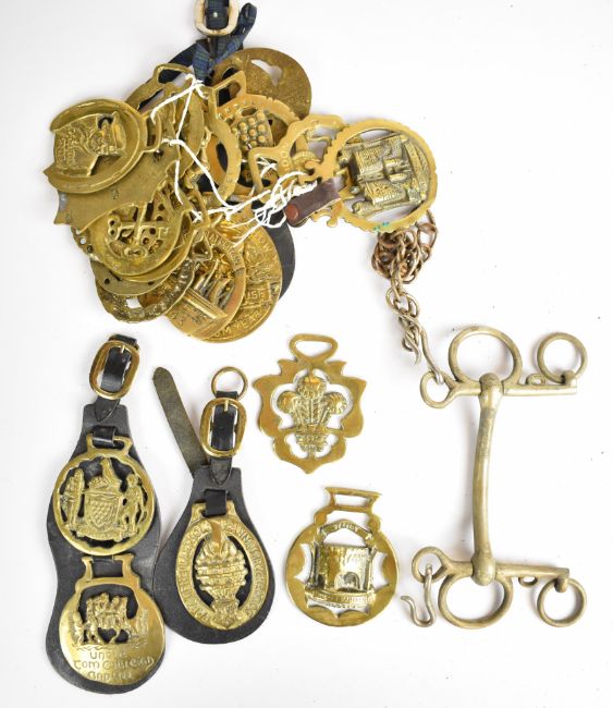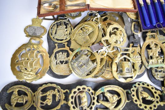 Approximately fifty horse brasses including Harlech Castle, Red Lion London, St. Mellons Show Tredegar House, Newport Harness Horse Parade, Bannaubrycheiniog, The Queen Windsor, Robin Hood, Five Arches Tenby, Arundel Castle, Massington Farm Rally, Mary Rose and Golden Hind, Cardiff Castle etc, some attached to leather straps together with a brass plate for E. Hipkins Dudley Inflexible and two Victorian cased sets of six teaspoons and knives