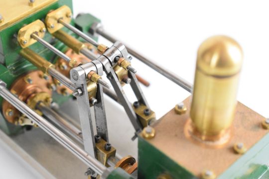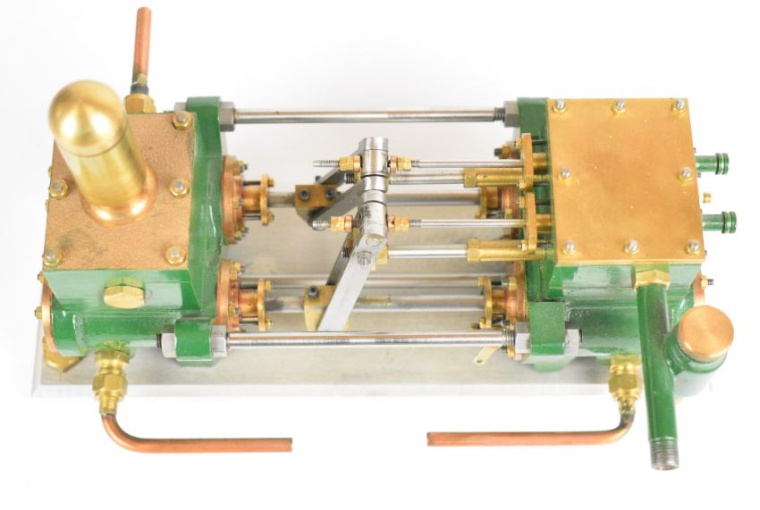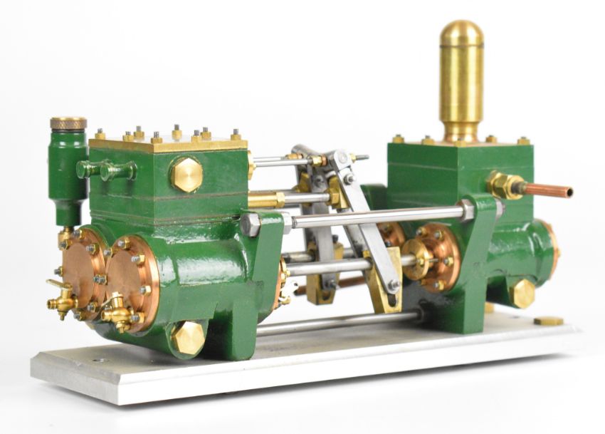 Southworth live steam model twin cylinder duplex water pump, with drain cocks on steam cylinders, displacement lubricator and pipe stubs, on aluminum base, built by Rob Dival, overall length 21.5cm