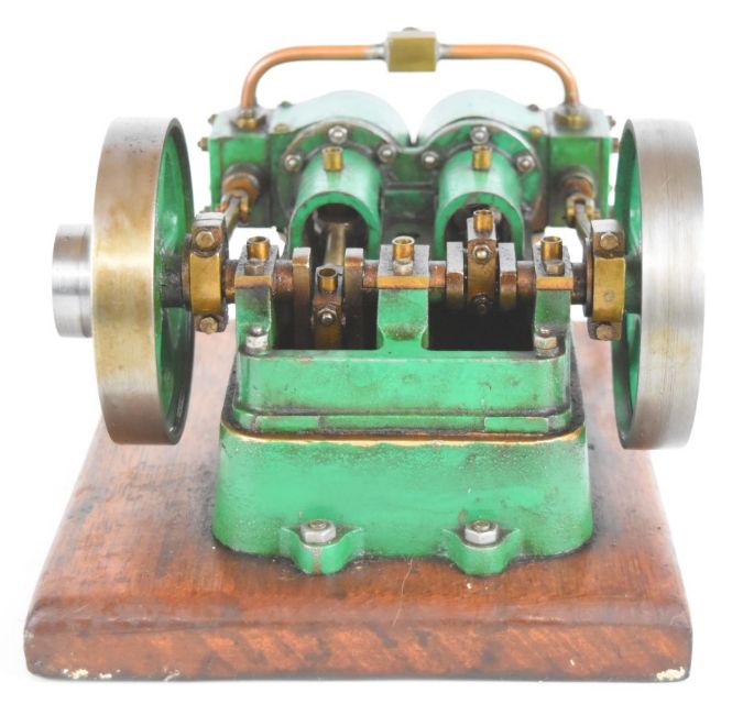 Stuart Score live steam twin cylinder engine on wooden base, overall length 19.5cm