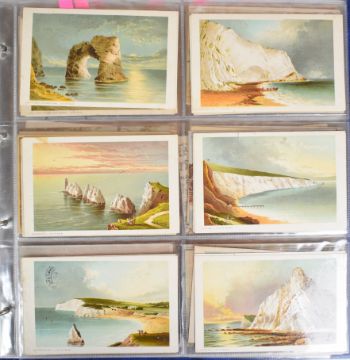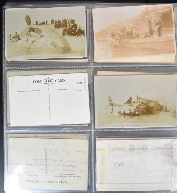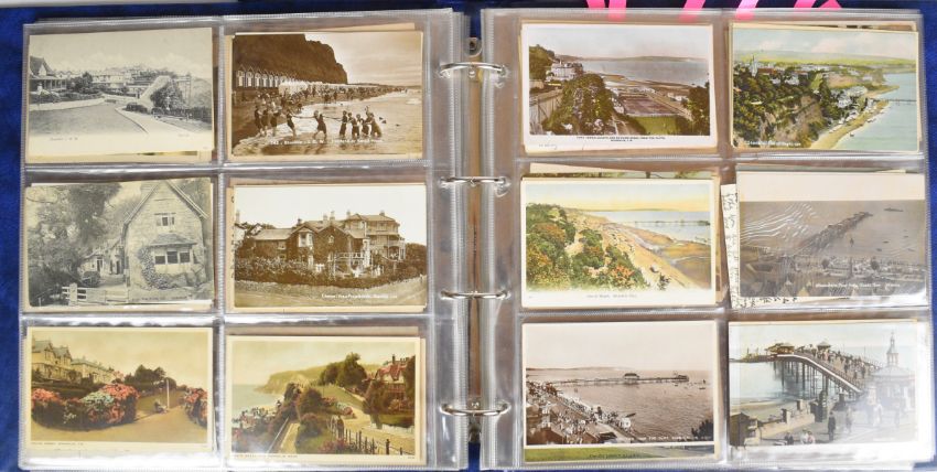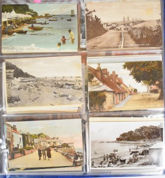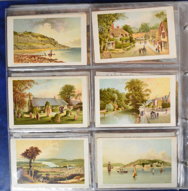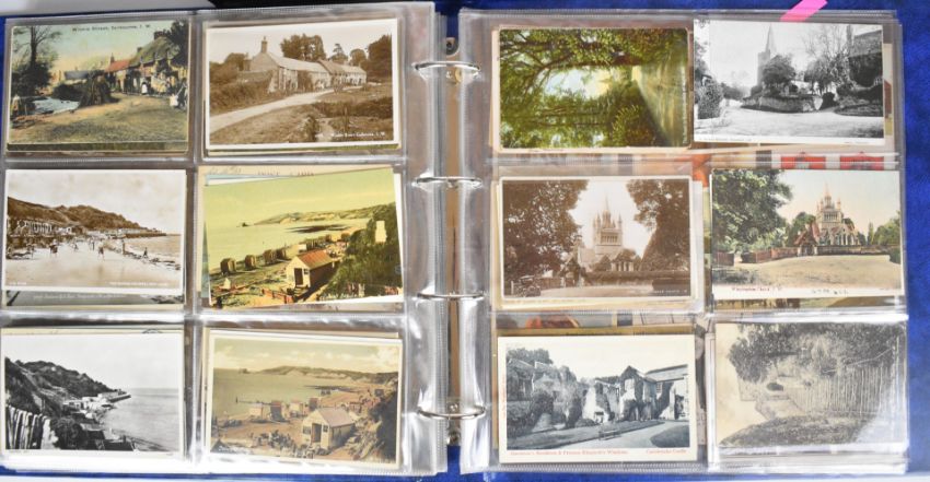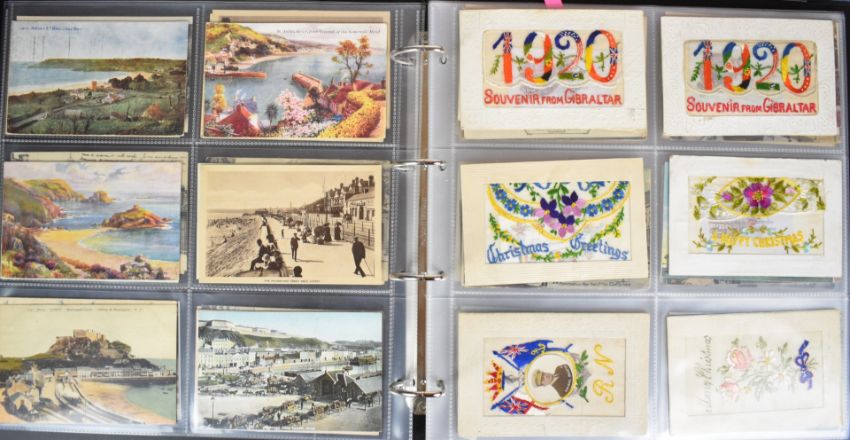 Large collection of over two hundred Edwardian and later postcards from the Isle of Wight, with topographical views and scenes including Floating Bridge at Cowes, Totland Bay Beach, Tuck’s “Oilette” series of cards, Shanklin Beach, Small Hope Bathing Beach, images of Shanklin Pier, Landslide at Luccombe 1925, Sandown, Canoe Lake at Ventnor, Cowes, Off the Royal Yacht Squadron Slipway & Clubhouse, Cowes week start of the 42 footers, images of social history in and around Ryde, Chale Bay during a gale, Alum Bay, Old Pillars near Lighthouse Niton, Freshwater Bay, images from Seaview, Totland Bay, Colwell Bay etc and twenty four views in and around Jersey, embroidered silk cards including 1920s Gibraltar souvenir, Christmas and Royal Navy with portrait of Admiral Beatty, others with busy street scenes including around London and several images showing the wreck of the warship HMS Gladiator off Yarmouth in 1908, all housed in two modern albums