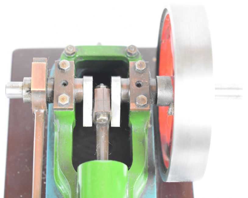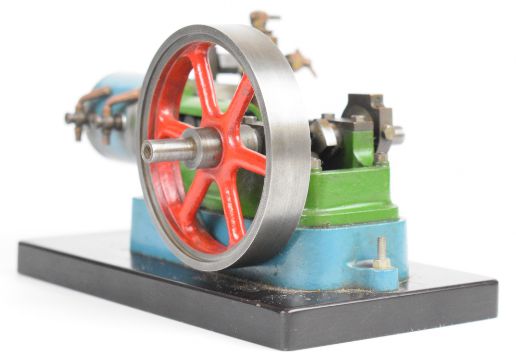 Stuart 10H live steam single cylinder engine with displacement lubricator and twin cylinder drain cocks, driving a spoked flywheel, on Tufnol or similar base, believed built by H.T. Barker, overall length 16.5cm