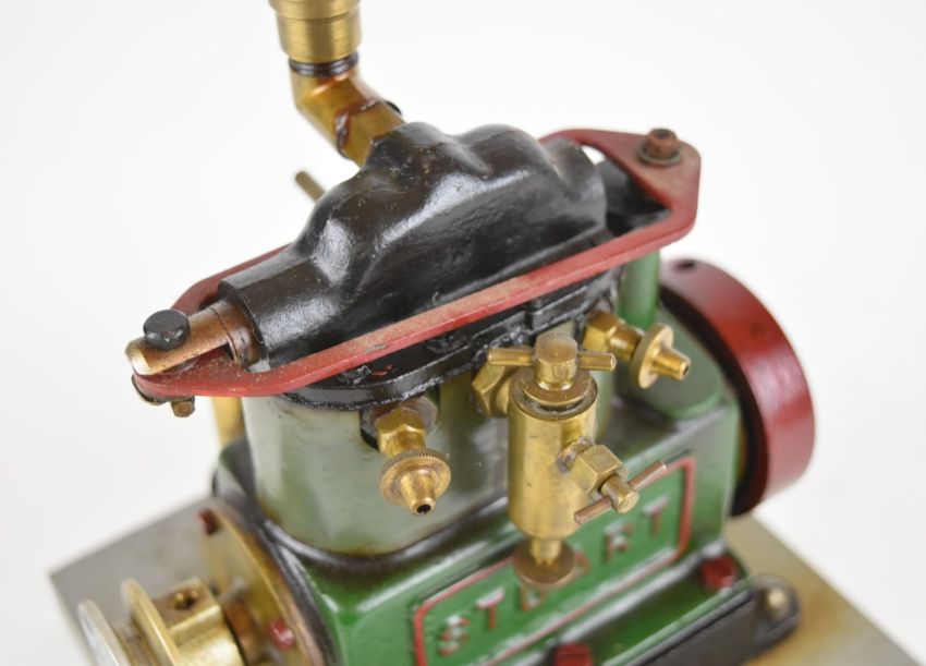 Stuart Sirius twin cylinder enclosed live steam engine with displacement lubricator, screw dipstick to standpipe to one side and solid flywheel, on wooden base, overall length 18cm