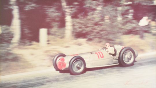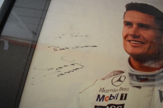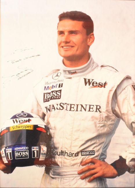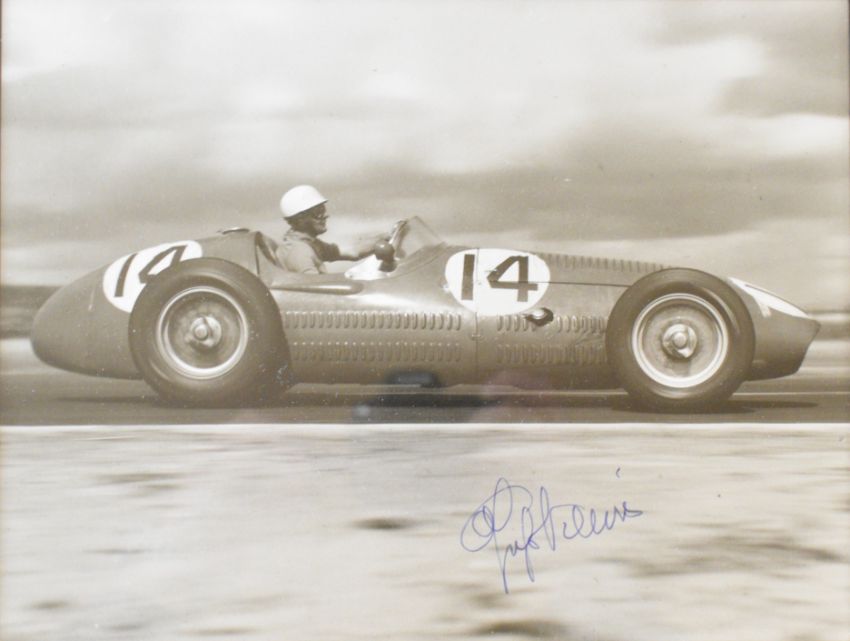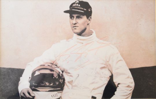 Six signed motor racing interest photographs comprising Michael Schumacher, David Coulthard, Louis Klemantski, Hermann Lang, Manfred von Brauchitsch with Jarrotts labels verso and Stirling Moss, together with a photograph of Luigi Villoresi in a Maserati 250f at the 1954 French Grand Prix, largest 49 x 35cm, all framed (7)