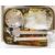 Little Wonder model hit and miss petrol engine castings and parts comprising part machined aluminium main castings, machined cylinder liner, two flywheel castings, piston casting and a tin of small parts including further con rod, piston rings, timing gears, valves, rockers and oilers, overall length of main block as currently assembled 19cm