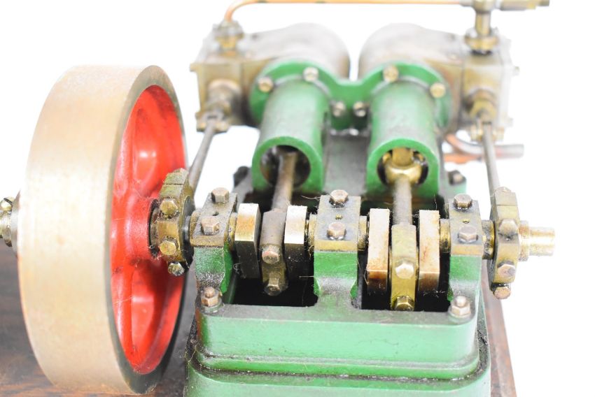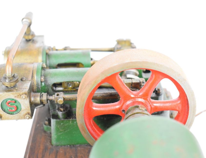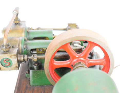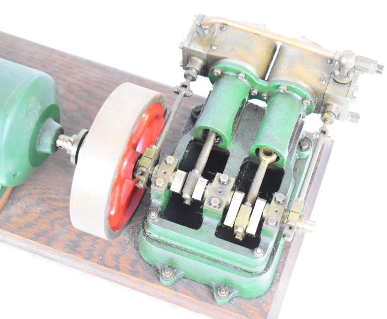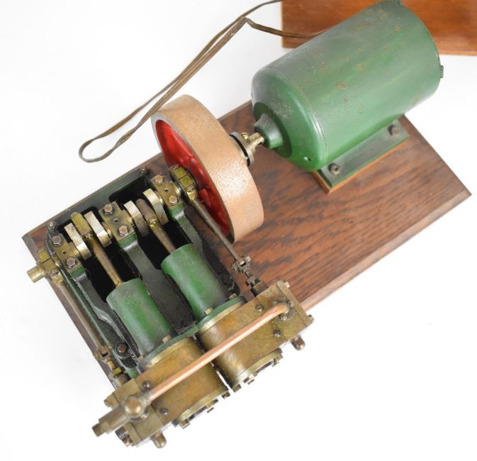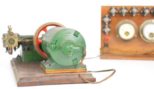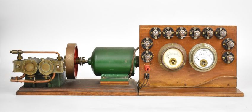 Stuart Score live steam twin cylinder engine generating plant comprising engine driving Electrolux motor/dynamo, wired to a separate board containing a display of bulbs with ammeter and volt meter, overall length of main base 29.5cm