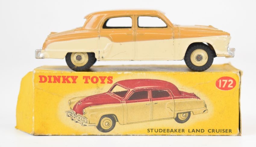 Three Dinky Toys diecast model cars comprising Humber Hawk 165, Studebaker Land Cruiser 172 and Plymouth USA Taxi 265, all in original boxes.