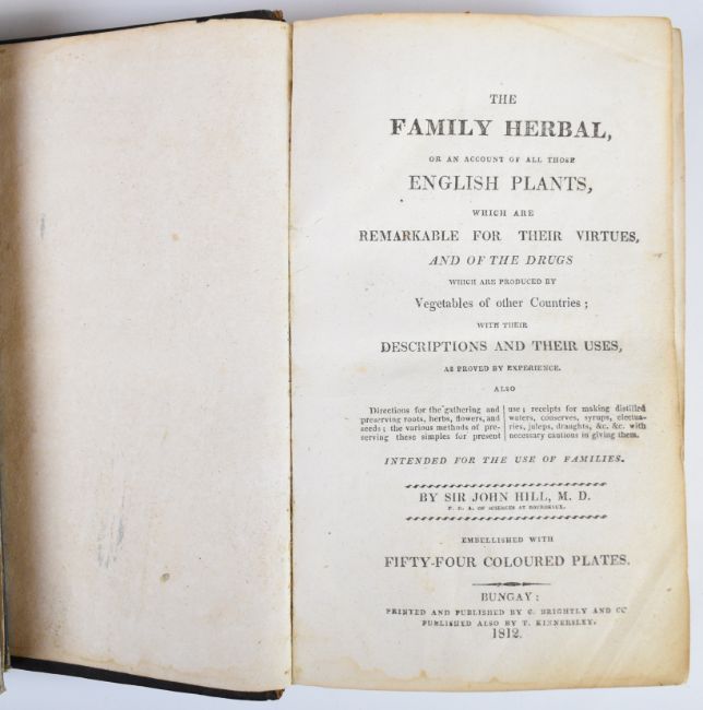 The Family Herbal, or An Account of All Those English Plants, Which Are Remarkable For Their Virtues, And of The Drugs Which Are Produced by Vegetables of other Countries by Sir John Hill and embellished with 54 hand-coloured plates (complete) printed and published by Brightly & Kinnersley 1812, bound in full 19th Century leather with a gilt lettered leather spine label, and a copy of Twenty Years’ History of Stroud 1870 to 1890 by John Libby with engravings including Imperial Hotel, School of Art, Marling School, Post Office, Subscription Rooms, hospital etc, bound in gilt lettered cloth (2)