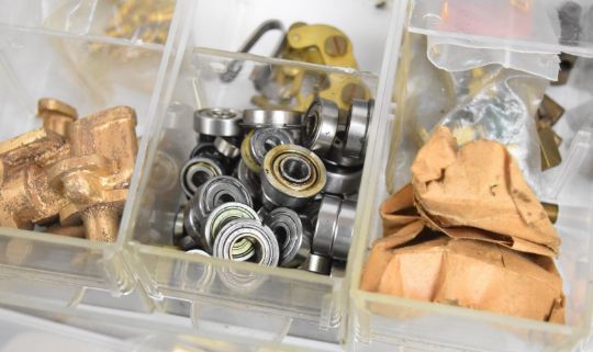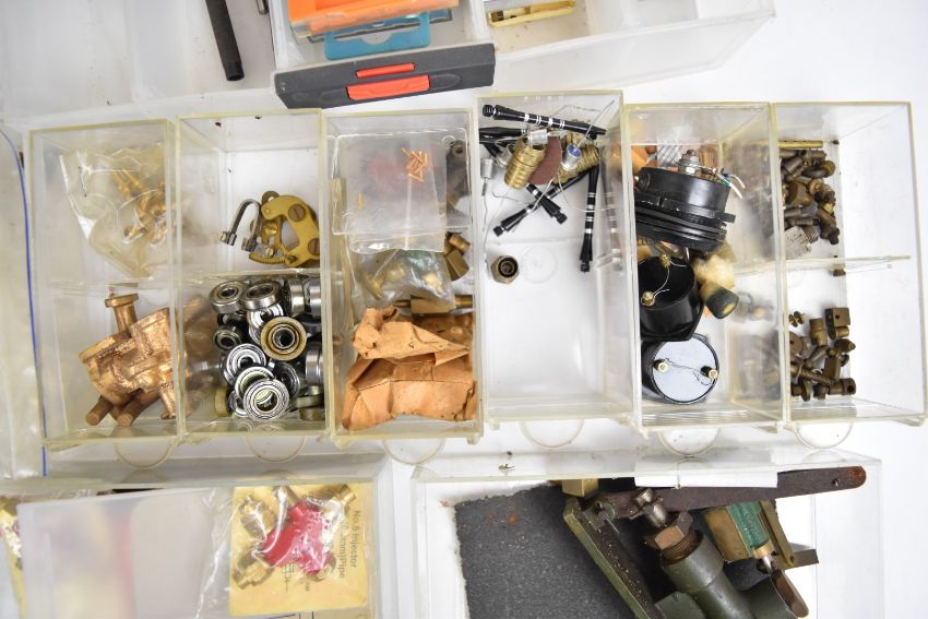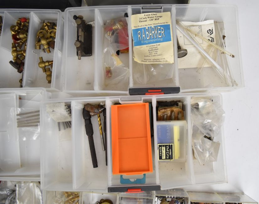 Live steam and model engineering small components contained in two sets of drawers, to include water gauges, ratchet lubricator, whistle, injectors including two Blackgates No 5 examples, valves, ball races, castings, two hand pumps, small drills and lathe tool inserts