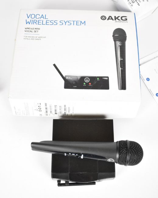 AKG microphones and headphones comprising P120 condenser mic, WMS40 mini vocal set and two K52 closed back headphones, all in original boxes.