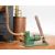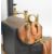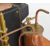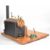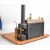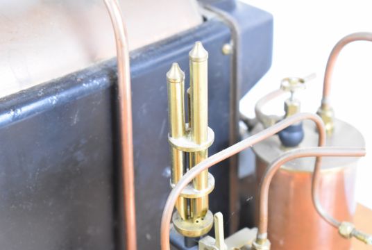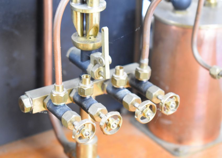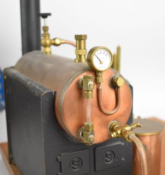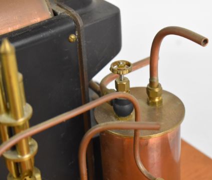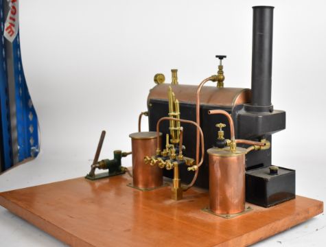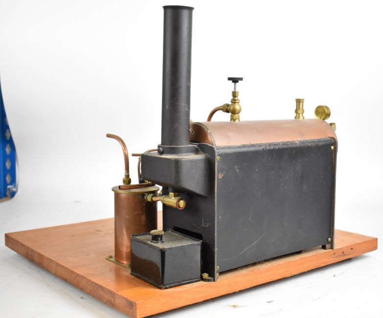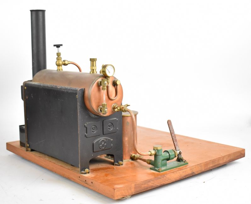 Stuart 504 copper live steam boiler with 0-80psi pressure gauge, safety valve, water level gauge and twin tube spirit burner, on wooden base with hand pump, steam manifold with chime whistle, water tank and exhaust separator tank, overall length of boiler 35cm, base 41.5 x 49.5cm