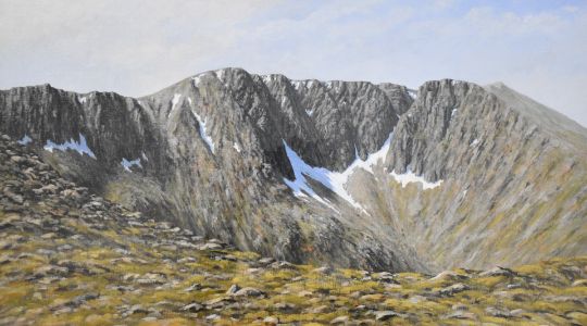 Ken Ferguson (British contemporary) oil on canvas Lochnagar Scottish Highlands mountain scene, 42 x 75cm, in gilt frame with Braemar Gallery label verso
