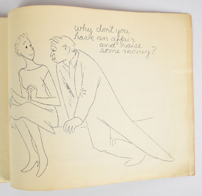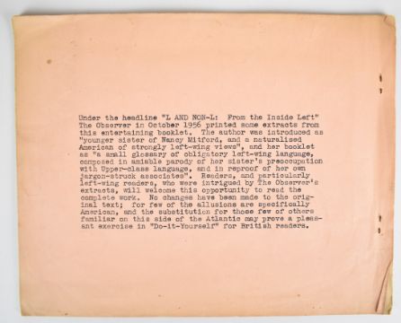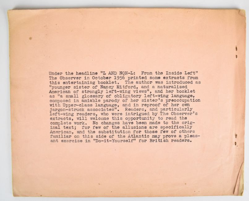 Jessica Mitford Lifeitselfmanship Or How To Become A Precisely-Because Man. An Investigation Into Current L (or Left-Wing) Usage by Decca Treuhaft & Illustrated by Pele (Phyllis de Lappe) printed by E. Marks and bound in illustrated wrappers [typed slip pasted inside cover reads that proceeds from the publication will go to the Daily Worker Fund]. Extracts of the publication were printed in The Observer October 1956, the author was in fact Jessica Mitford writing in response to Noblesse Oblige by her elder sister Nancy