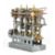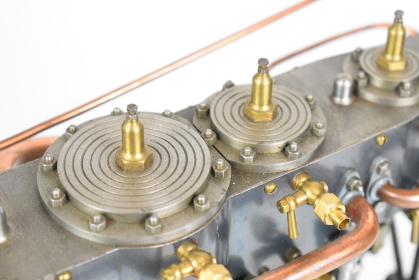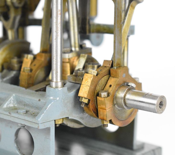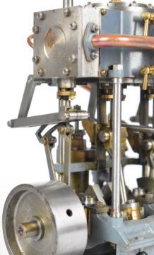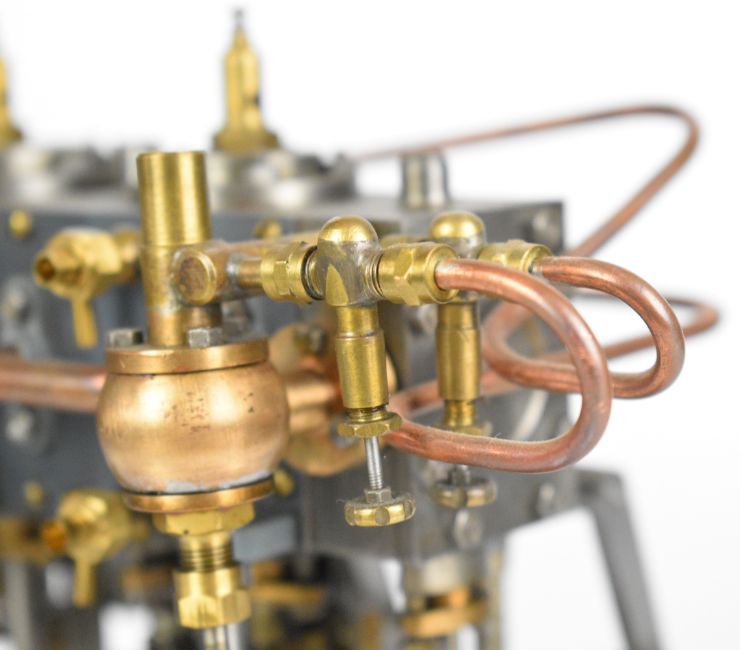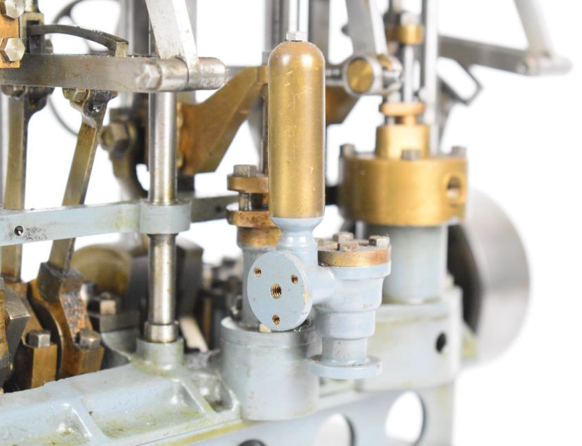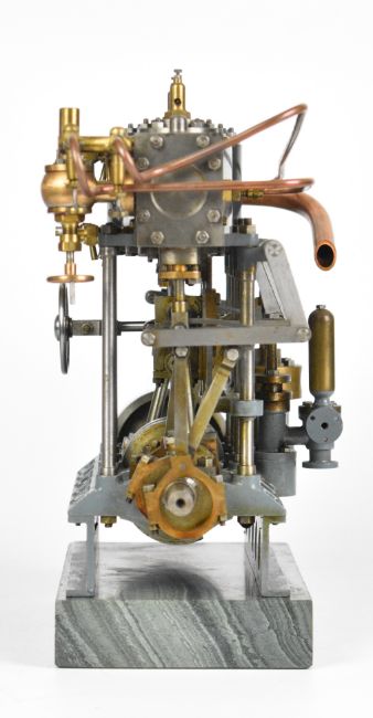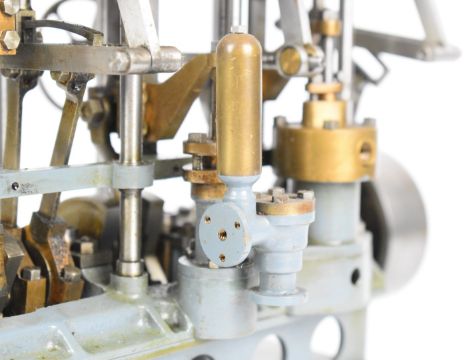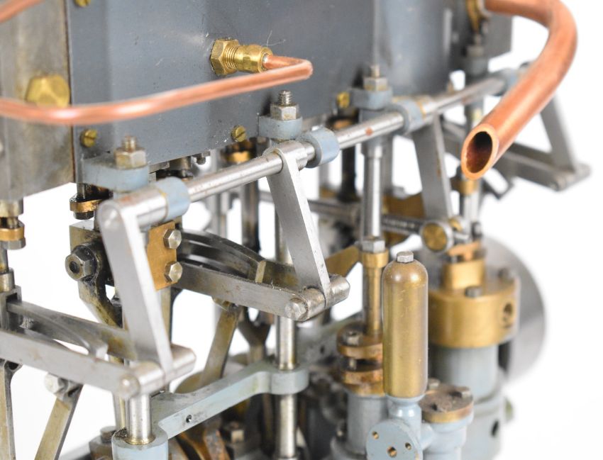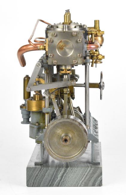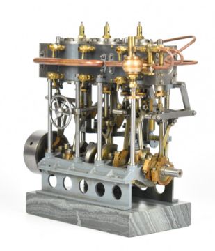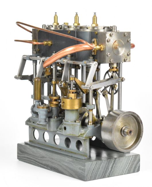Stuart triple expansion live steam marine engine, with drain cocks to all cylinders wheel operated Stephenson's link reversing gear, throttle valve with twin simpling or bypass valves, driving a solid flywheel and crosshead driven feed water pump and air or condenser pump on drilled girder supports mounted on a Honister slate block, overall length 24.5cm, together with drawings for the engine