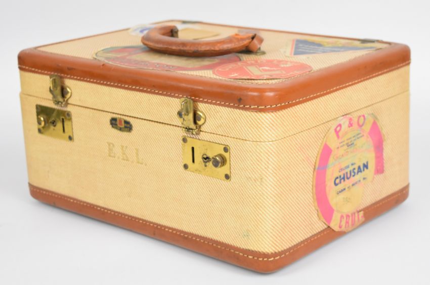 Victor Luggage ladies vanity case with leather trim and shipping line labels for Cunard White Star, first class and stateroom baggage, Bergen Line, P&O Chusan etc, W35 x D25 x H17cm