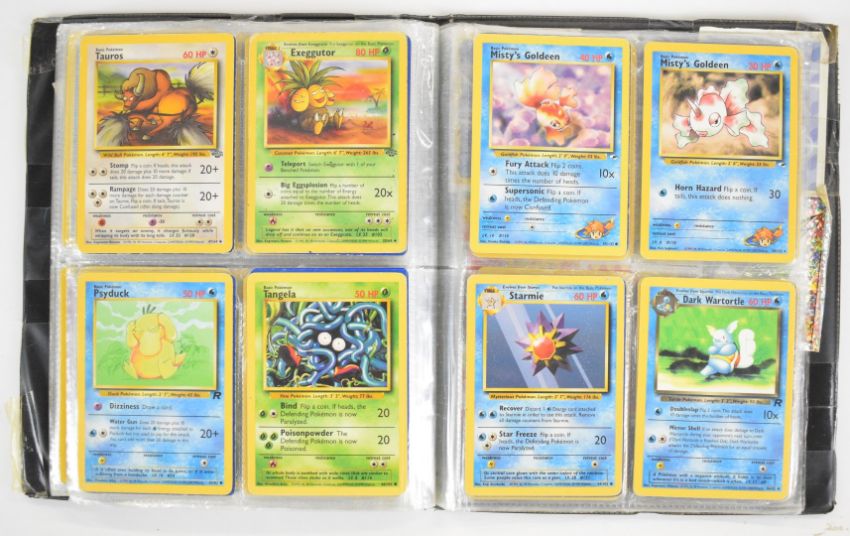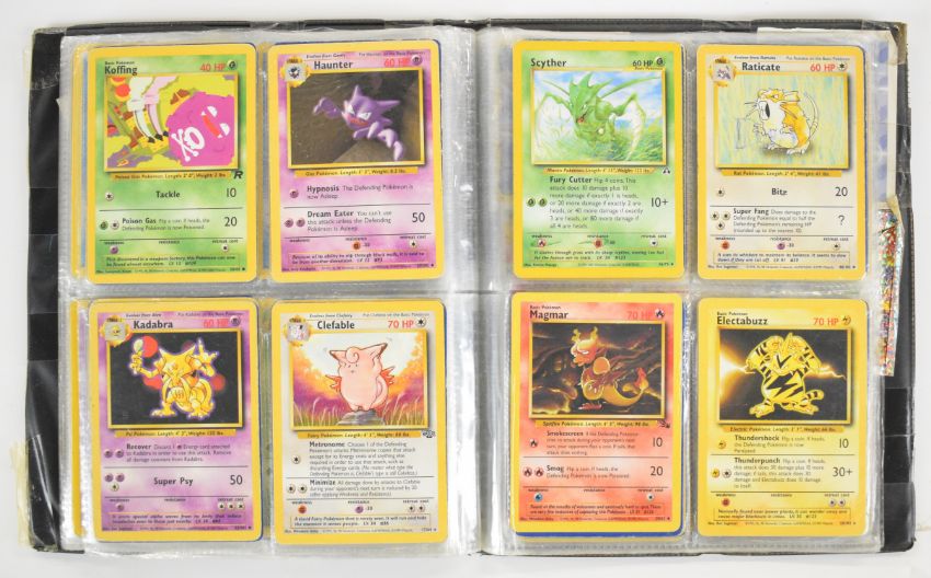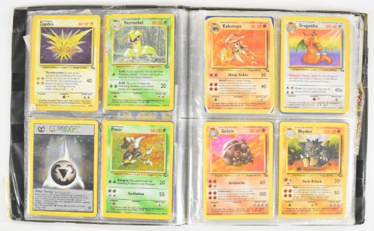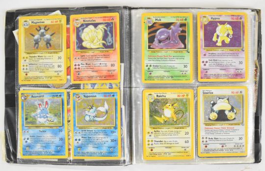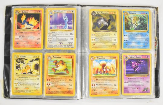 Pokémon folder containing approximately one hundred cards, Base, Fossil, Rocket etc, to include Holos Blastoise, Zapdos, Poliwrath, Ho-oh, Vaporeon, Azumarill, Raichu, Snorlax, Mewtwo, Machamp, Gyarados, Hypno, Nidoqueen and Kangaskhan.