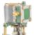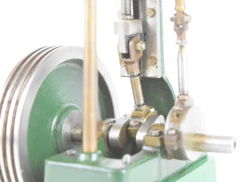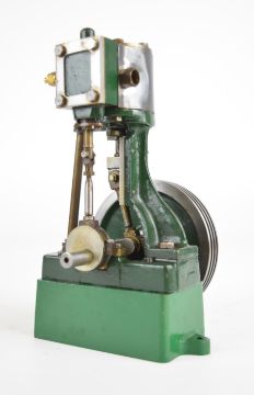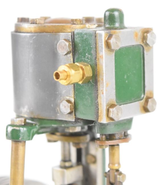 Vertical single cylinder live steam engine in the style of a small Stuart No 1, with grooved solid flywheel, height 15cm