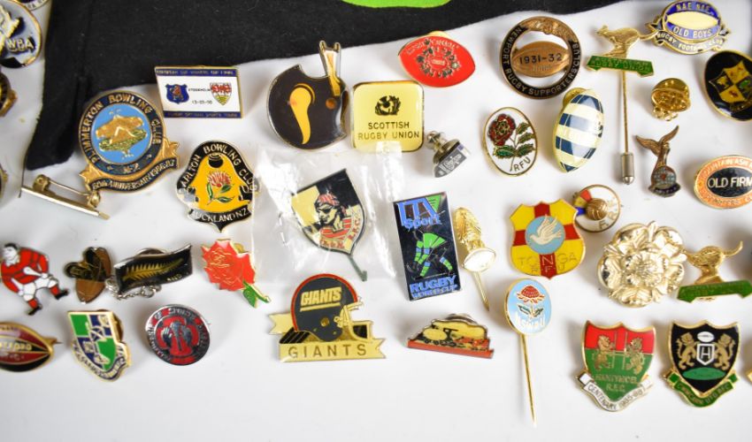 [Sporting] New Zealand Maori Rugby Tour of Wales 1982 framed souvenir with collection of enamel and metal badges and pins for All Blacks, Kiwi and Tonga RFU, others for Christchurch Papanui bowling, Carlton, Akaroa, Fitzroy and Plimmerton bowling clubs, N.S.W. R.U., Alberta and Ontario Rugby Union, Australian RU, Fiji, South Africa, Rugby Canada, Mountain Ash, Penryn, Cwmcarn and Niagara RFC, Scottish Rugby Union, Newport & District Rugby Supporters Club badges 1921-2, 1928-9, 1931-2, 1952-3 and 1953-4, Nae Nae Old Boys Rugby Football Club, Nantymoel 1985-6, Llandybie, Boroughmuir, Petone, Stratford, Redruth and Cardiff RFC, Gloucester Rugby Union. Boston RFC, Eden Rugby, British Columbia Festival of Sports medal etc and five New Zealand colour souvenir felt flags