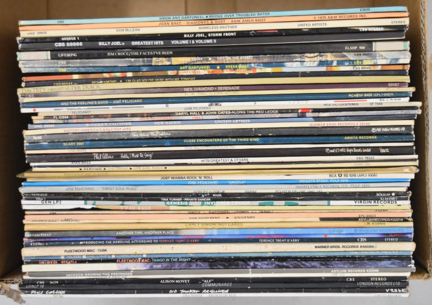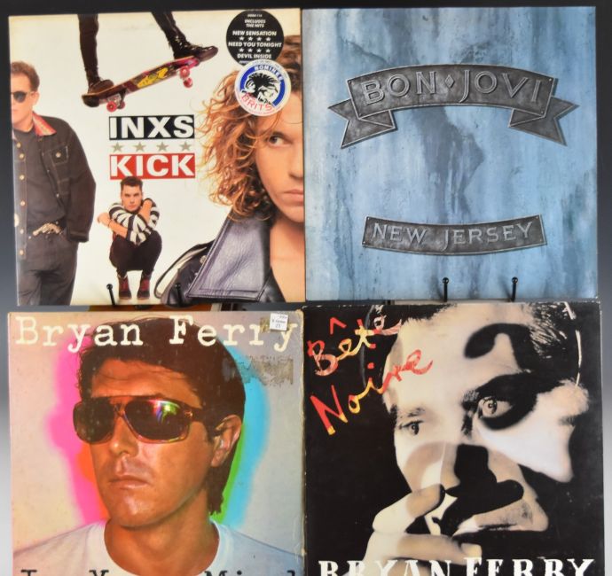 Approximately forty four Rock and Pop LPs comprising Queen, Bruce Hornsby, The Pretenders, Kate Bush, Roxy Music, Bryan Ferry, Bon Jovi, INXS, Robbie Robertson, The Fixx, Capercaillie, 10cc, James Brown, Dave Edmunds, Fleetwood Mac, Marc Bolan, Joe Cocker, Neil Young, Eric Clapton, Clannad, Santana etc