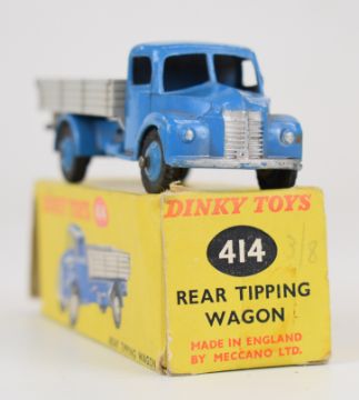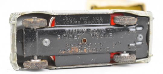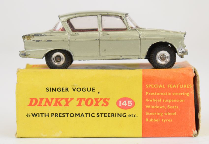 Three Dinky Toys diecast model cars comprising Singer Vogue 145, Cunningham C-5R Road Racer 133 and Rear Tipping Wagon, all in original boxes.