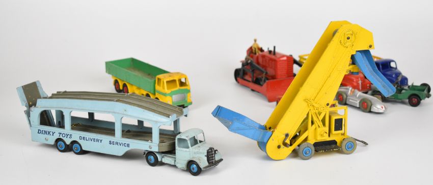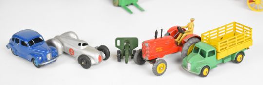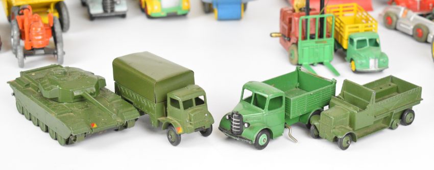 Forty-five vintage Dinky diecast model cars, trucks, military and agricultural vehicles to include Ford Sedan, Peugeot 203, Austin Atlantic, Zephyr, Citroen 2CV, Riley, Austin Devon, Dodge Flatbed Truck, Armoured Personnel Carrier and Blaw Knox Bulldozer.