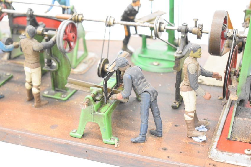 Stuart 10H live steam single cylinder plant, the single cylinder engine having twin cylinder drain cocks, driving a spoked flywheel, fed from a Stuart 501 boiler with safety valve, main steam valve, water level gauge glass, 0-150psi pressure gauge and spirit boiler (with Southern Federation boiler test certificate dated 1993), this being fed from a Stuart hand feed water pump, the engine driving a display of 12 Wilesco and similar line shaft driven tools, overall size of display 89 x 33cm