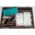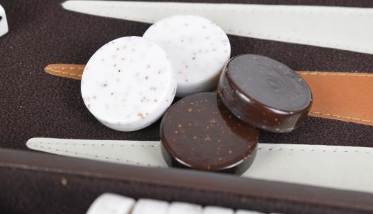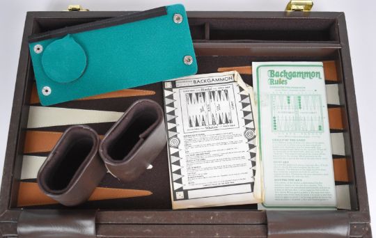 Designer Backgammon set with thirty counters, dice, shakers and rulebook, in fitted leather case with embroidered panels front and back.