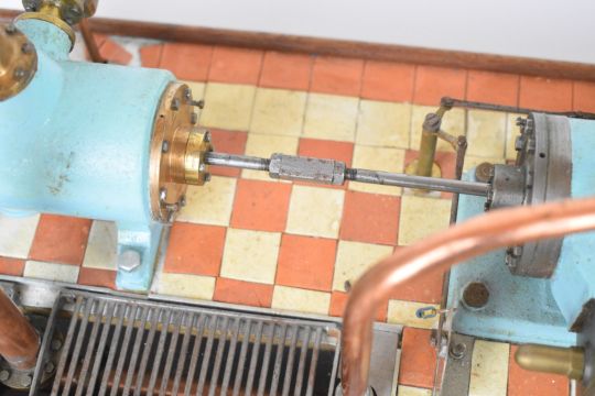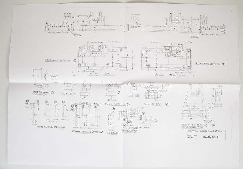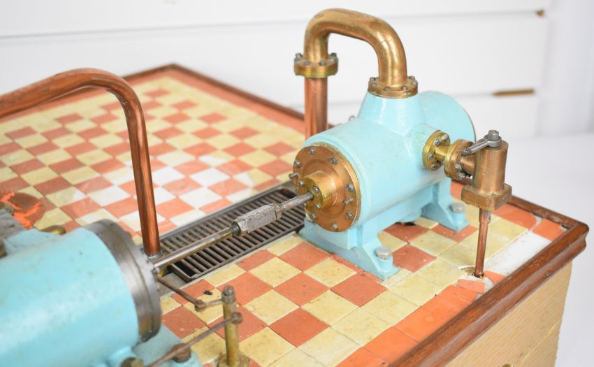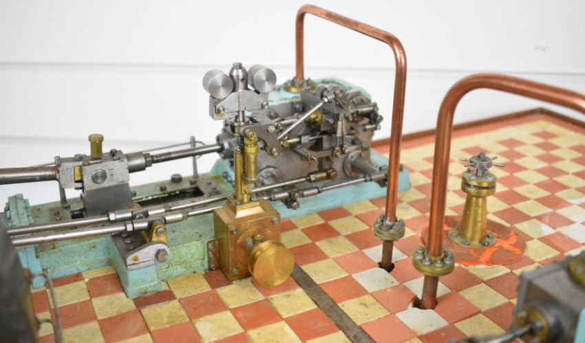 Exhibition standard Southworth Corliss valve live steam cross compound mill engine, the Corliss valved cylinder valve gear being controlled by a working governor and fed from a pedestal mounted main steam valve, the low pressure cylinder having twin drain cocks operated from a quadrant and the steam then feeding into a condenser, the whole engine having brass cup oilers to the eccentrics, slides and main bearings and lubricators to both big ends allowing them to be oiled without stopping the engine, the engine driving a spoked pulley and spoked flywheel with barring teeth, the barring lever and stand both being present, the flywheel being guarded by miniature hand rails, all on a miniature tiled base, overall size 89 x 47 x 29cm, together with a set of drawings for the engine and booklet