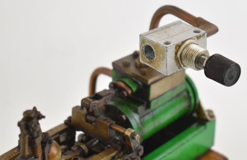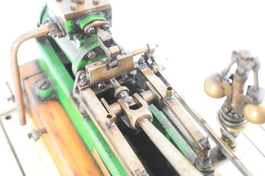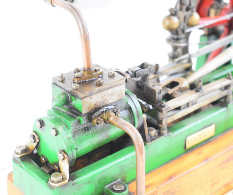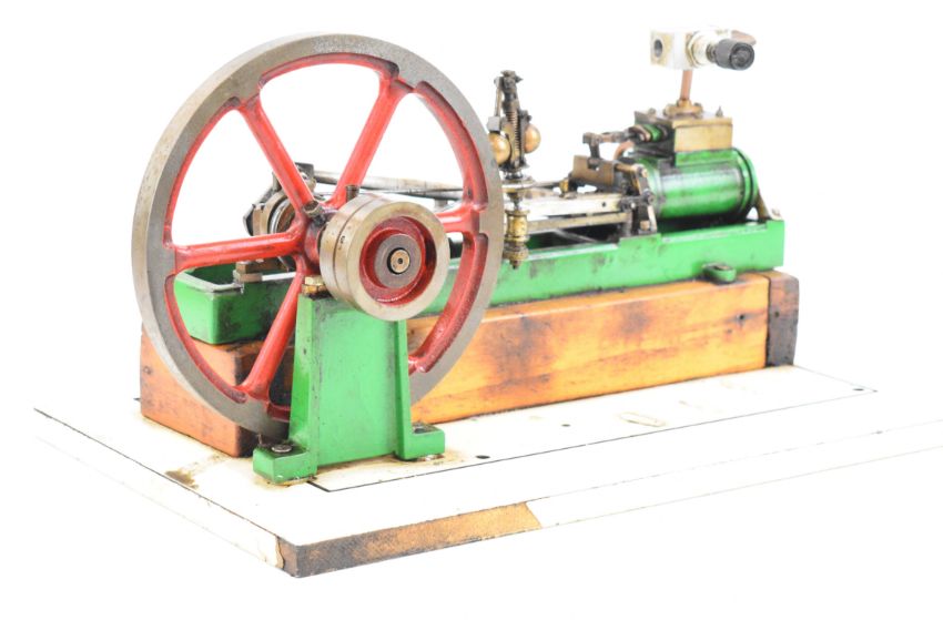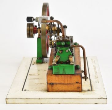 Stuart Victoria live steam single cylinder mill engine with spoked flywheel, belt driven dummy flyball governor, cup oilers to main bearings and slides, the cylinder having twin cylinder drain cocks, on a wooden base, overall size 25 x 40cm