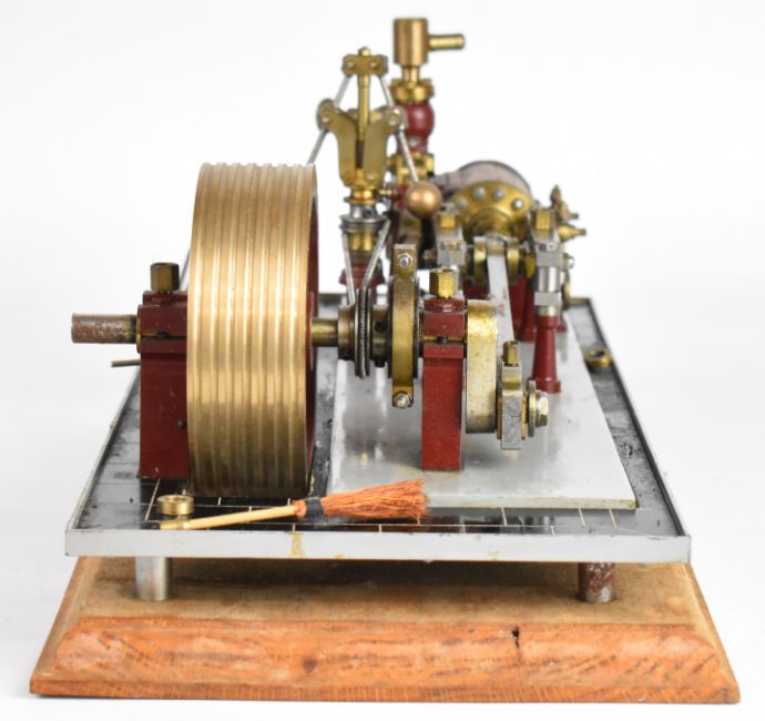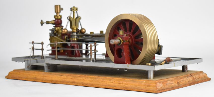 Bernard Walker single cylinder live steam mill engine with grooved drive pulley, twin cylinder drain cocks and governor, named to valve chest cover and dated 2005, on faux tiled base with hand rails, overall length 42cm