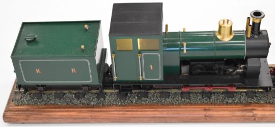 34mm gauge model of a steam rack railway locomotive and two carriages, built by the award winning late Harry Clyne. Made as a promotional model for the reinstating of the railway at Kinlochleven in the Highlands of Scotland, the project for which Harry Clyne was a major part, overall length 130cm