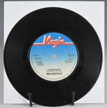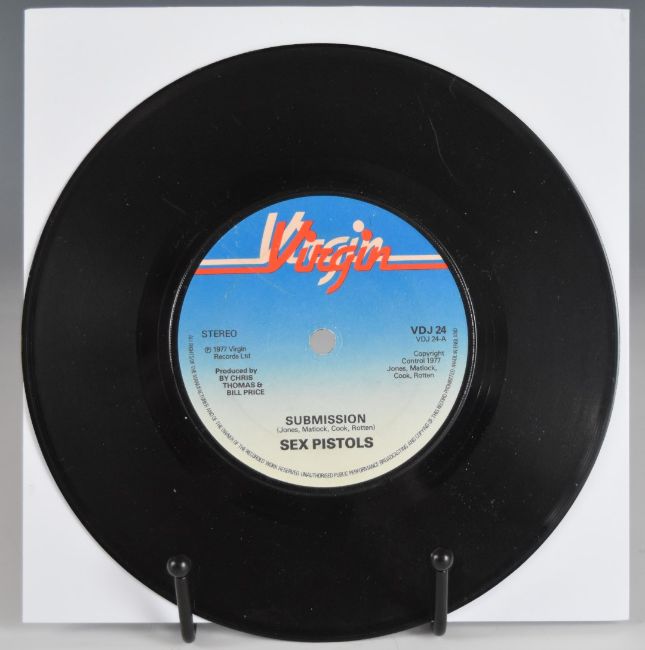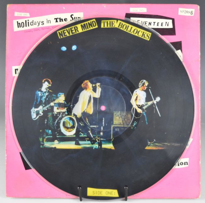 Three Sex Pistols LPs comprising two copies of Never Mind The Bollocks one being a picture disc and Never Mind The Bollocks 1983 The Bollock Brothers, together with 7" single Submission (VDJ24) single sided promo only release given away with early copies of Never Mind The Bollocks LP